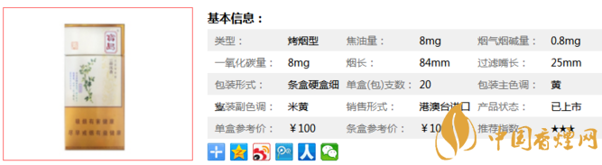 | 類型 :烤煙型 | 焦油量 :8mg | 煙氣煙堿量 :0.8mg | 一氧化碳量 :8mg |