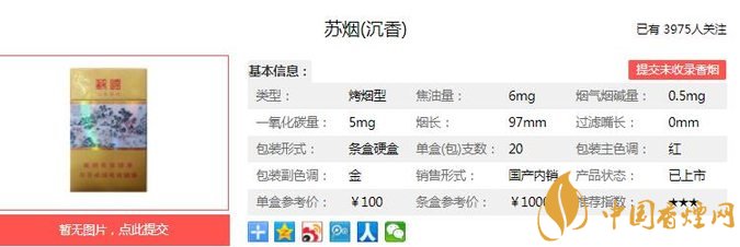 蘇煙沉香,其價位應(yīng)該是細(xì)支香煙中最高的品牌香煙。蘇煙沉香香氣優(yōu)雅協(xié)調(diào),沉香香氣獨特、高雅,且與煙草本香完美融合,煙氣細(xì)膩,濃度和勁頭適中、口感舒適生津。經(jīng)香煙網(wǎng)小編市場調(diào)查蘇煙沉香售價為100元/包。