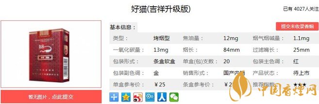 好貓吉祥升級(jí)版煙支長(zhǎng)84mm,過(guò)濾嘴長(zhǎng)25mm,添加中草藥提取物“豐和液”,在保留煙草本香的同時(shí)有效降低主流煙氣中的各項(xiàng)有害物質(zhì)指標(biāo),提高卷煙的吸食安全性。下面我們一起來(lái)看好貓吉祥升級(jí)版的參數(shù)信息:焦油量:11mg 煙堿量:1.1mg 一氧化碳量:13mg