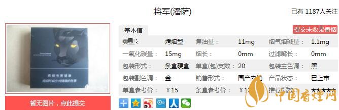 雪茄型卷煙是雪茄和卷煙的融合之作,雪茄型卷煙既符合了年輕、時尚一族消費(fèi)者新的消費(fèi)需求,又具有鮮明的時尚個性和濃厚的雪茄風(fēng)格。2010年,山東中煙就推出了一款極具創(chuàng)新風(fēng)格的雪茄型卷煙 ——將軍(潘薩),在上市初期,就以鮮明的時尚個性和濃厚的雪茄風(fēng)格成為了雪茄型卷煙市場的“新寵”,引領(lǐng)中式雪茄新風(fēng)尚。下面就由香煙網(wǎng)小編帶大家一起來了解將軍潘薩的相關(guān)信息。