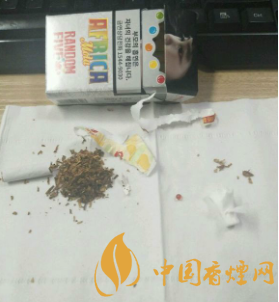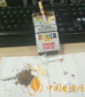 這款煙的外包裝除了有惡心的忠告圖意外,還是比較漂亮的。煙盒下方標有“AFRICARANDOMFIVE”煙盒上方是忠告圖吸煙有害健康的一些標語。