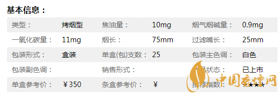 | 類型 :烤煙型 | 焦油量 :11mg | 煙氣煙堿量 :1.1mg | 一氧化碳量 :13mg |