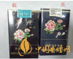正面商標(biāo)紙差異對比:真品卷煙采用絨面印刷工藝,花形悉心勾勒,更顯質(zhì)感,圖案“牡丹花”更為寫實。假冒偽劣“牡丹(軟藍)”多以舊版“牡丹花”造型進行模仿,其圖案與真品存在明顯差異。